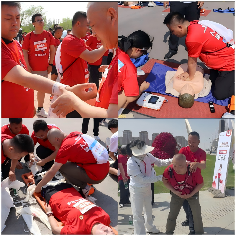 此次比赛融合 8 公里定向越野徒步与应急救护技能考核,设置心肺复苏(CPR)+AED 操作、气道异物梗阻处置、外伤包扎、大腿骨折固定 + 担架搬运四项核心任务。武家塔露天煤矿参赛队员身着统一队服,在环乌兰木伦湖赛道上交替完成徒步打卡与技能挑战。在 “心肺复苏 + AED 操作” 环节,队员张伟与王莎配合默契,从判断意识、胸外按压到除颤仪使用一气呵成,仅用时 1 分 15 秒便通过裁判验收;“大腿骨折固定 + 担架搬运” 任务中,队长王慧指挥队员用健肢固定法快速完成伤员固定,搬运过程中严格遵循 “平稳行进、防止跌落” 要求,以零失误完成通关。