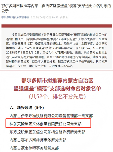 近日,根据内蒙古自治区党委组织部《关于开展全区坚强堡垒“模范”支部选树命名工作的通知》等相关要求,在各旗区、市各直属党(工)委评估验收、逐级推荐的基础上,经联审比选、全面考察、会议研究等程序,神东天隆集团文化创意有限责任公司党支部成功入选鄂尔多斯市推荐内蒙古自治区坚强堡垒“模范”支部选树命名对象。