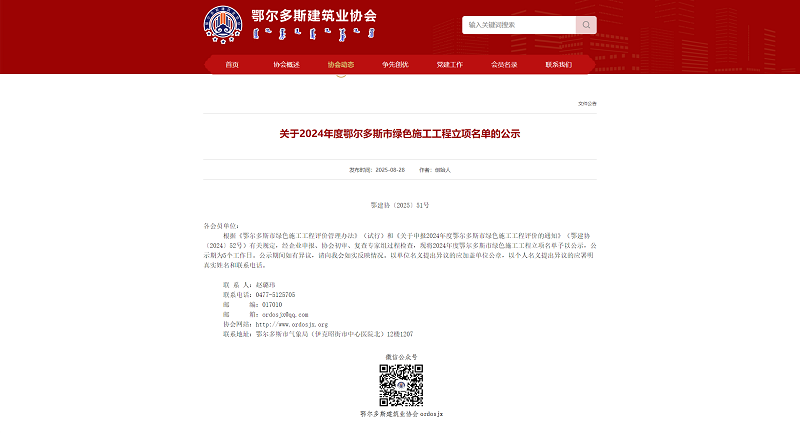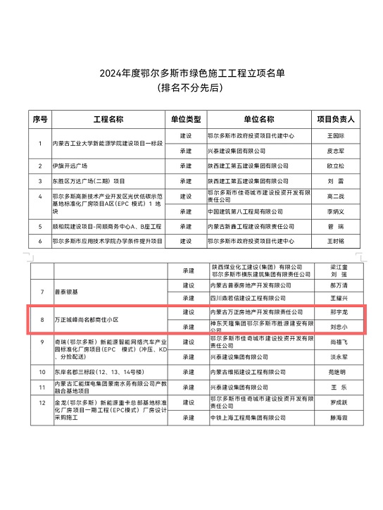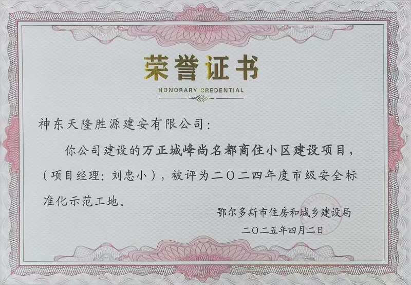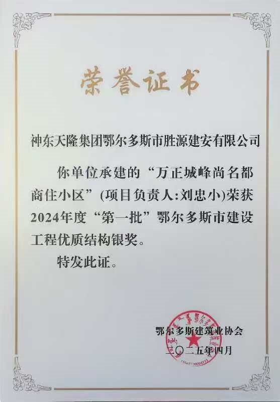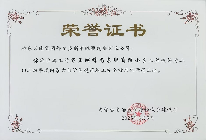 近日,从内蒙古自治区住房和城乡建设厅和鄂尔多斯建筑业协会获悉,由神东天隆集团工程建设有限公司(胜源建安)承建的万正·峰尚名都(康和云璟)项目荣获2024年度市级“安全标准化工地”、鄂尔多斯市建设工程优质结构银奖、内蒙古自治区建筑施工安全标准化示范工地三项荣誉,同时入选2024年度鄂尔多斯市绿色施工工程立项名单,进一步提升了工程建设公司在鄂尔多斯市建筑市场的品牌形象。