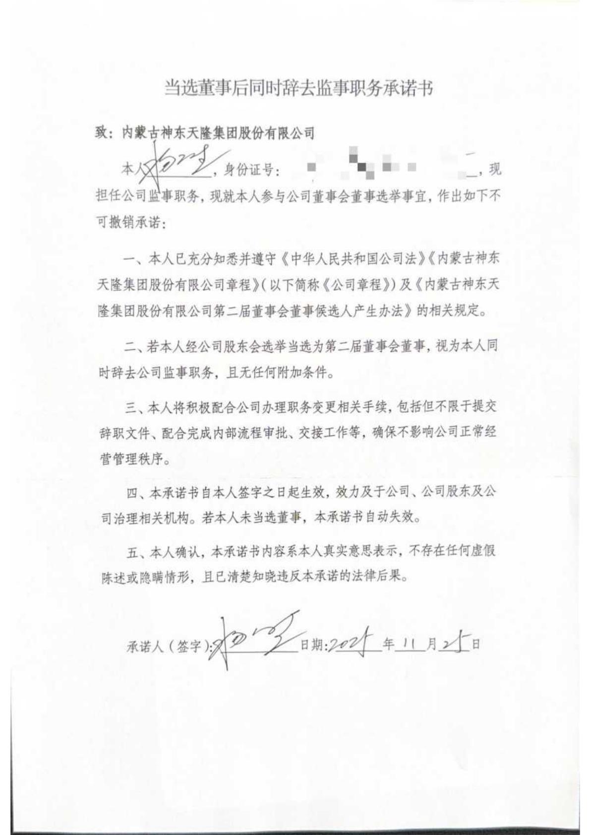 2025年11月4日公司第二届董事会第二十二次会议审议同意启动董事补选程序。按照11月18日公司第二届董事会第二十三次会议表决通过的《内蒙古神东天隆集团股份有限公司第二届董事会董事候选人产生办法》,根据11月18日至11月21日第二届董事会补选董事候选人提名情况,经补选董事工作领导小组对候选人资格进行初审,并于11月25日第二届董事会第二十四次会议审议表决通过,最终确定了补选董事候选人名单,现将公司第二届董事会补选董事候选人进行公示,公示期从11月25日至11月28日中午12点,公示期间,对于有异议的候选人,股东可实名向公司补选董事工作领导小组举报。