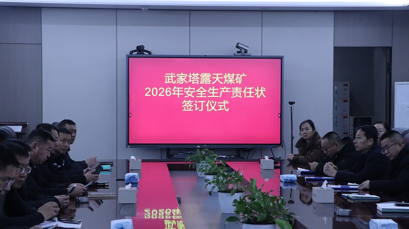 为全面压实安全生产责任,筑牢矿山安全防线,1月6日,武家塔露天煤矿在智能化会议室隆重举行2026年安全生产责任状签订仪式。武家塔露天煤矿矿长刘海兵、党委书记蒙晓超及全体矿领导、各科室区队负责人以“签字立状”的庄严形式,明确安全使命,凝聚奋进力量,为全年安全生产工作划下责任标线。