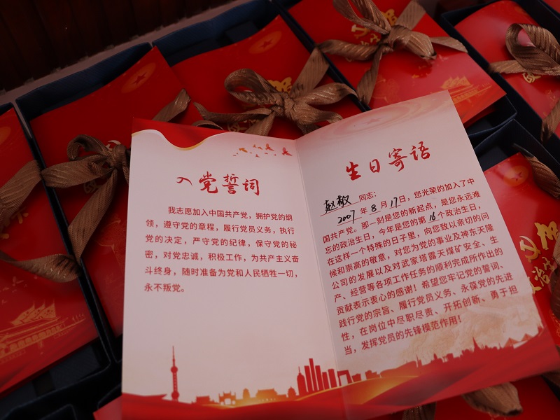 活动尾声,党委书记杨志平代表中共内蒙古神东天隆集团股份有限公司武家塔露天煤矿委员会向各基层党支部书记发放全矿162名党员七一建党节纪念品。希望在新的征程上矿内党员干部能够继续保持清醒头脑,筑牢精神的堤坝,不忘初心、勇毅前行、担当作为,以更加积极的态度和饱满的热情投入安全生产工作中。