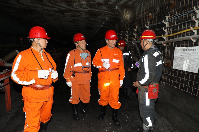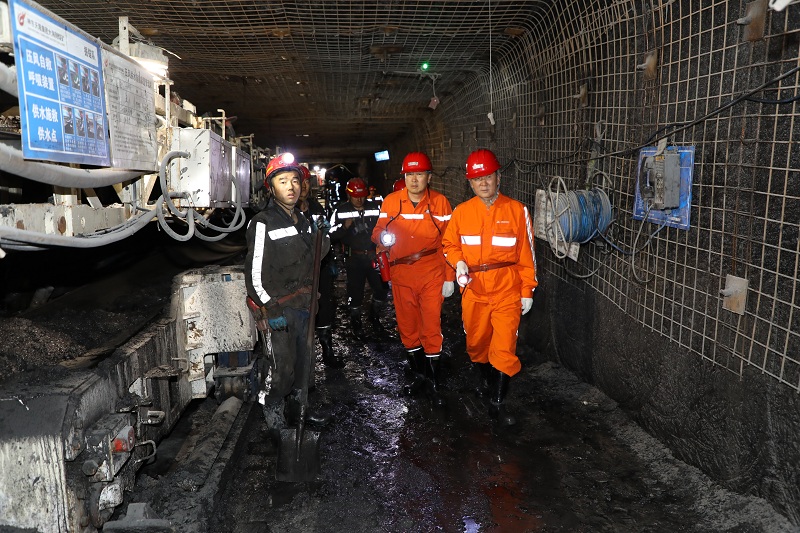 董事长杨飞云一行首先来到大海则煤矿实地察看了办公楼、职工宿舍及餐厅等基础设施建设情况。随后,深入井下51101回风顺槽、胶运顺槽掘进工作面查看了掘锚、连采设备运行和队伍建设情况,并与大海则煤矿领导班子、施工单位负责人召开了座谈会议。