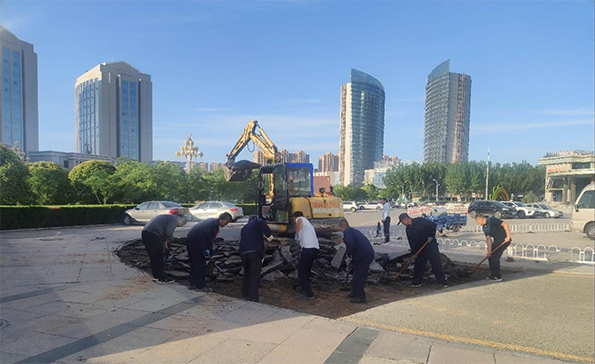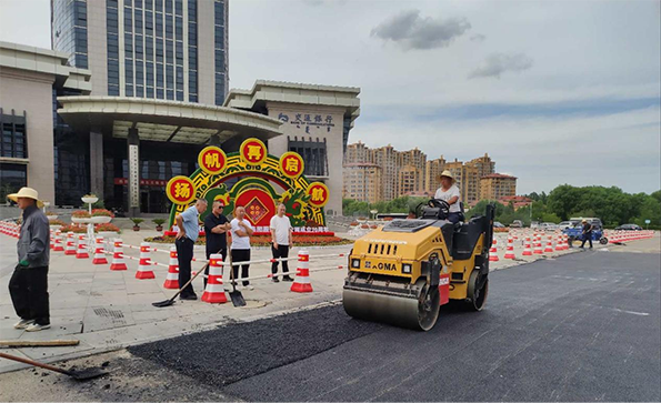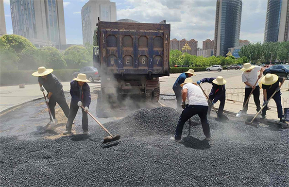 近日,在伊旗阿镇天隆集团公司广场施工现场,天隆物业公司维修一队的修路工人忙开了。一辆沥青保温运输车正在缓慢卸着沥青料,烫得人难以靠近,测温枪显示沥青温度为156°C。卸下沥青后,工人师傅们拿着铁锹、推拉杆和手推平板夯以最快的速度把沥青均匀铺在刚铣刨好的路面上,随后压路机跟上反复碾压,把沥青压实,才算基本修复完成。短短几分钟下来,10多名工人师傅们的工作服已经被汗水浸透。