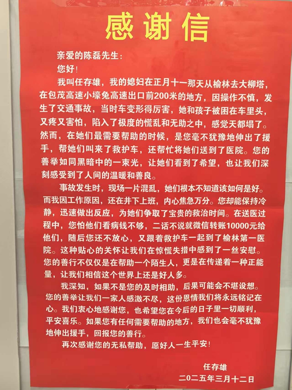 2025年2月8日(农历正月十一),陈磊驾车途经包茂高速小壕兔段时,目睹前方一辆新能源汽车失控撞上隔离带。车辆严重变形、浓烟弥漫,车内驾驶员与两名儿童被困,情况万分危急。陈磊当即停车,冒着车辆可能自燃的风险,奋力破开车窗,成功救出三人。随后,他迅速拨打急救电话,陪同伤者前往榆林市第一医院,垫付了1万元住院费,协助办理手续,直至联系上伤者家属后方才离开。