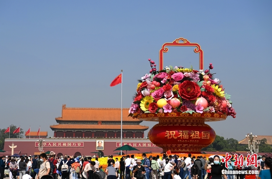 9月25日天安门广场“祝福祖国”巨型花果篮和长安街沿线14个花坛已经完工并正式亮相,迎来了不少的游客进行驻足观看,拍照留念。在夜晚灯火点亮之后,游客数量不减反增,争先一睹这寓意祖国强盛,人民团结的花篮。