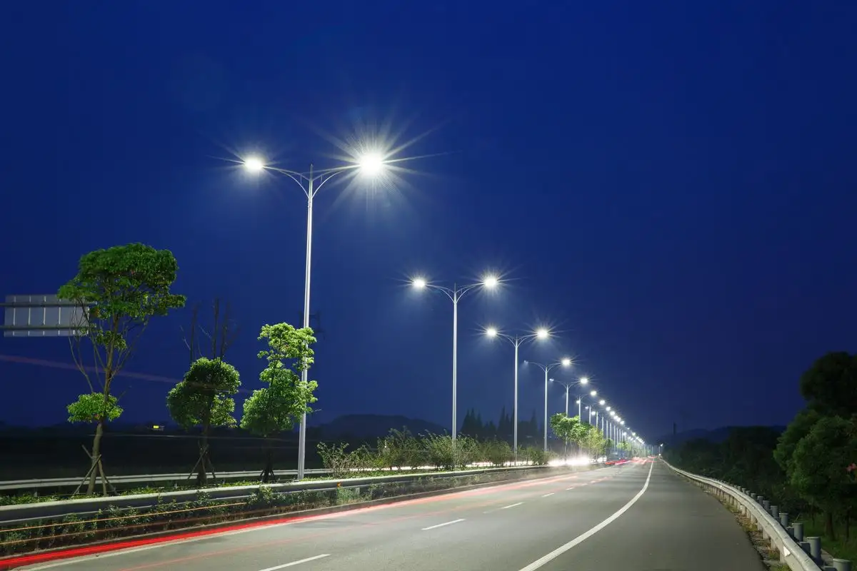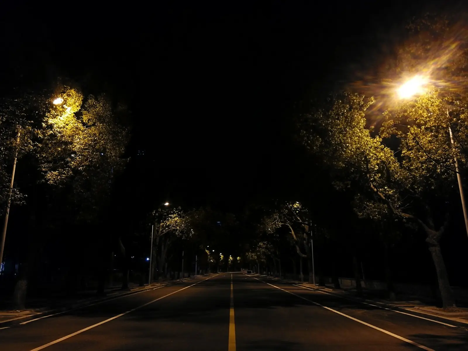 路灯笔直得立在道路的两边像一条条平行线,又像一个个士兵,或许站在那里照亮路面是它的工作也是它的职责吧。