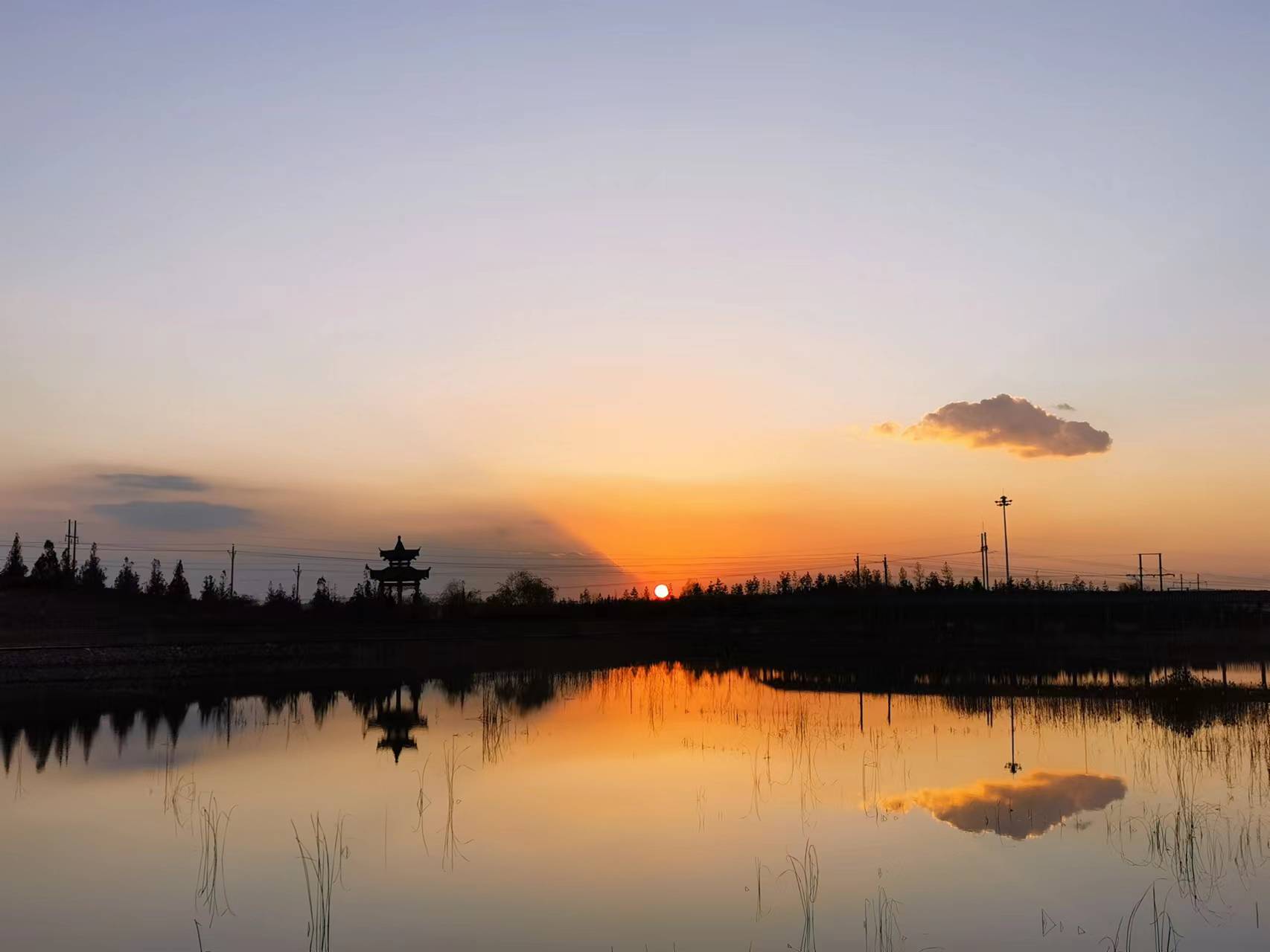 “清潭待月影,孤亭守寒秋。一抹闲云入水流,浮影做轻舟。