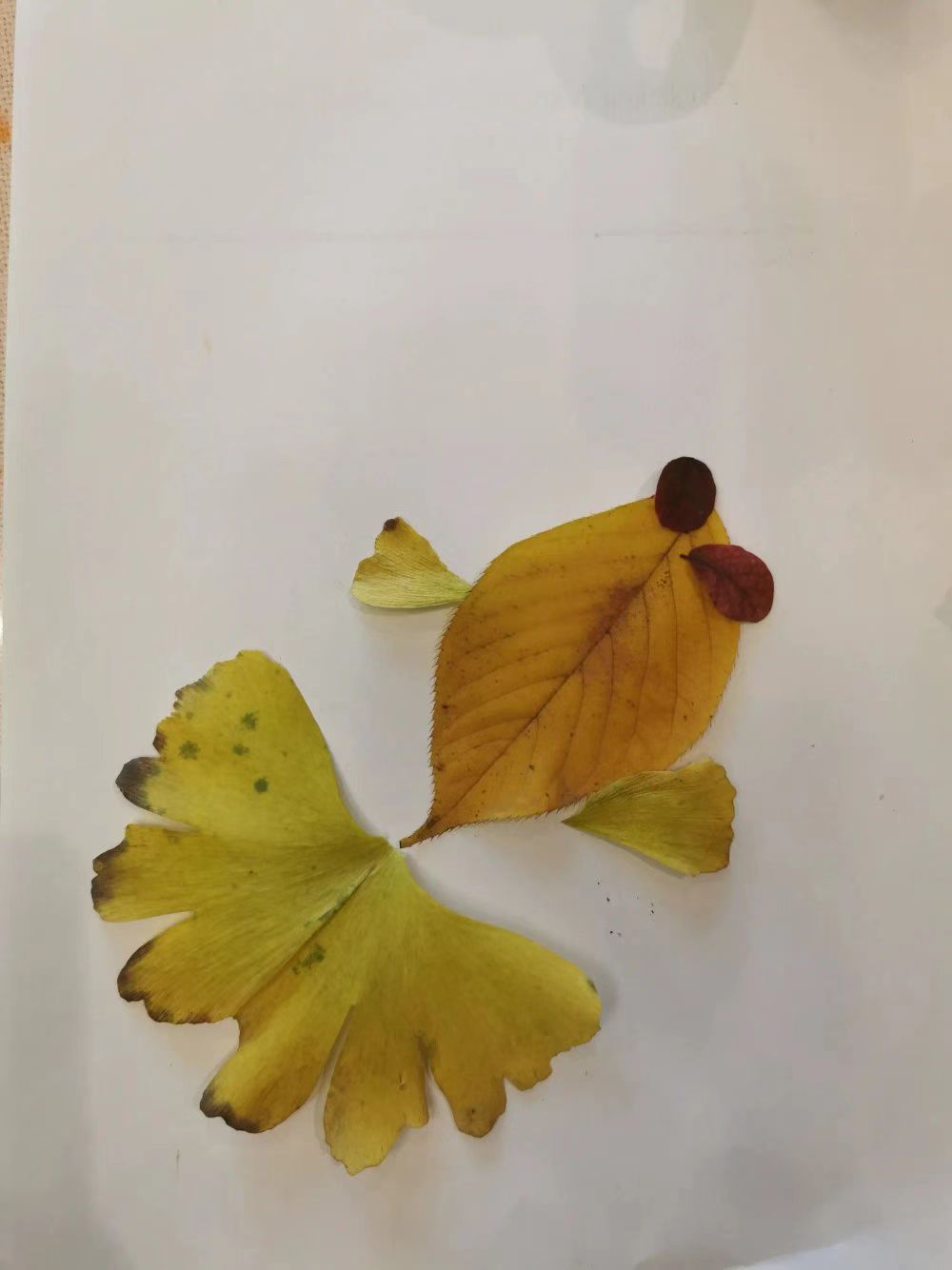 这个秋天,我采集了各种落叶,它们不仅五颜六色,而且形状各异,可以做出好多的树叶拼图。有小鱼,大象,彩蝶等好多的图案,它们有着和谐的自然美。