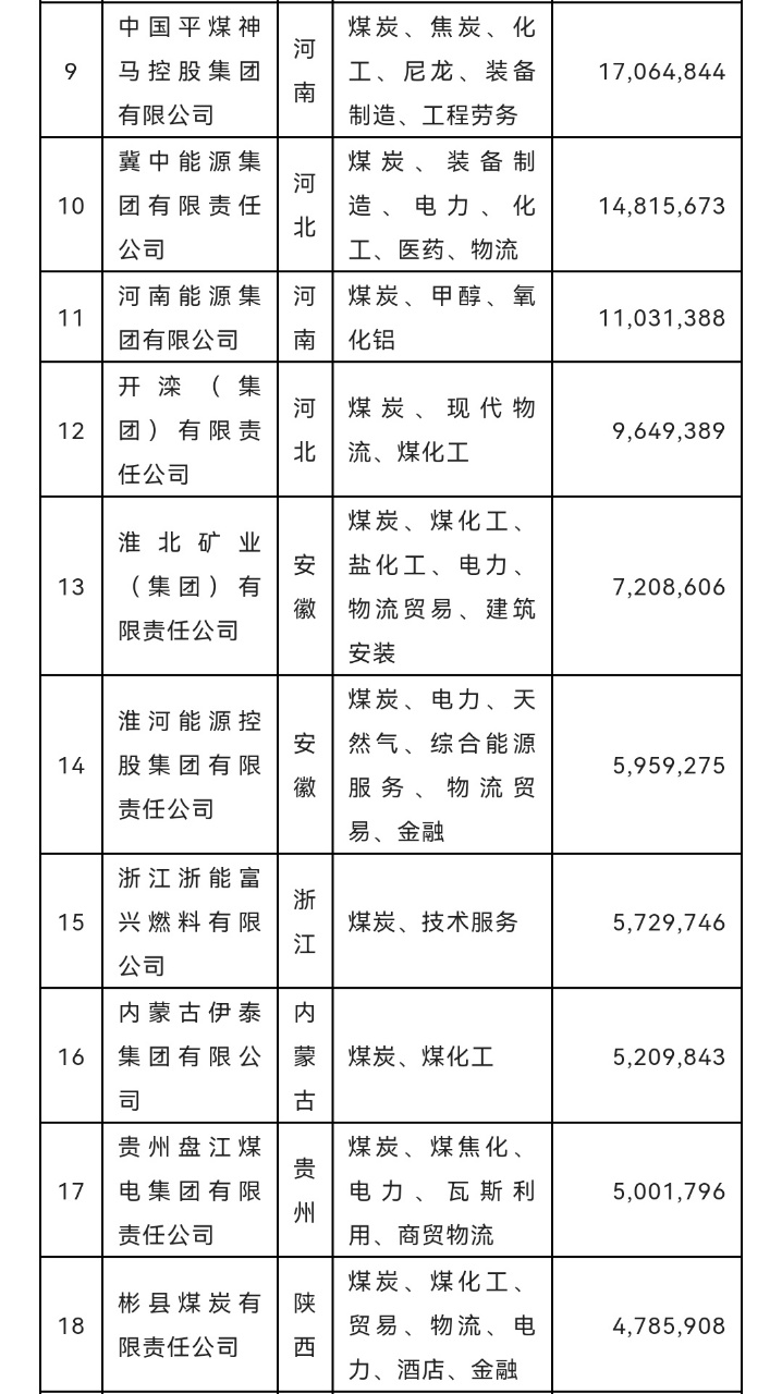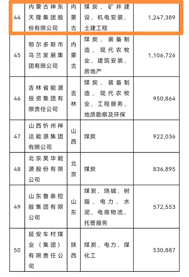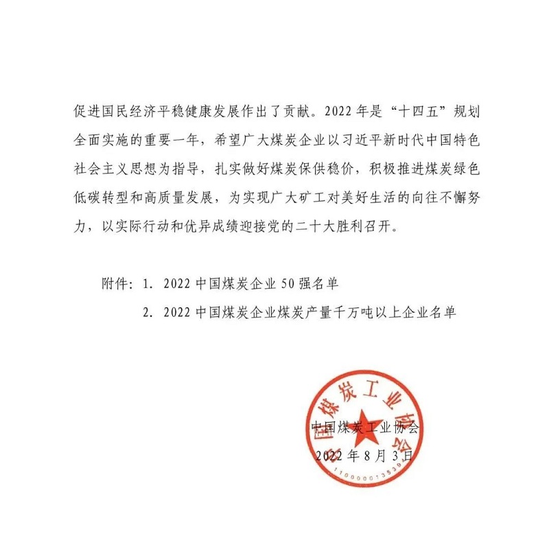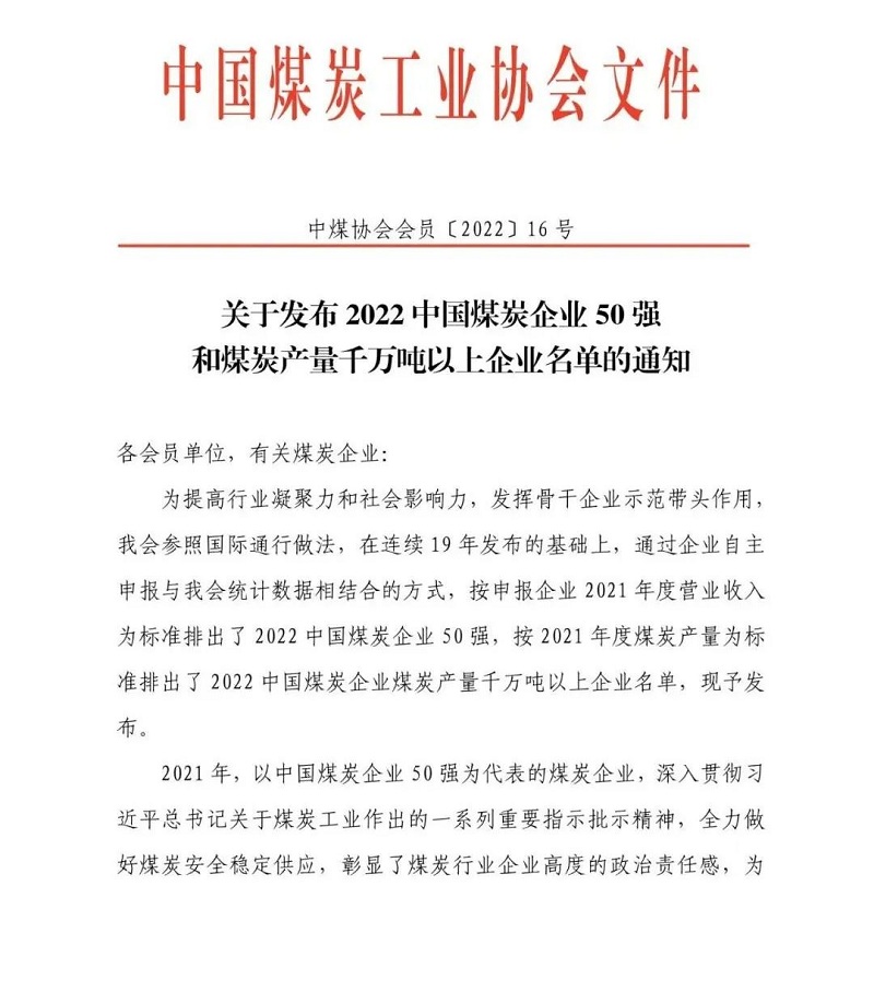 近日,中国煤炭工业协会根据2021年营业收入和煤炭产量情况,发布了2022年度中国煤炭企业50强和煤炭产量千万吨以上企业名单,集团公司榜上有名,位列“2022中国煤炭企业50强名单”第44位,位列“2022中国煤炭企业煤炭产量千万吨以上企业名单”第36位。