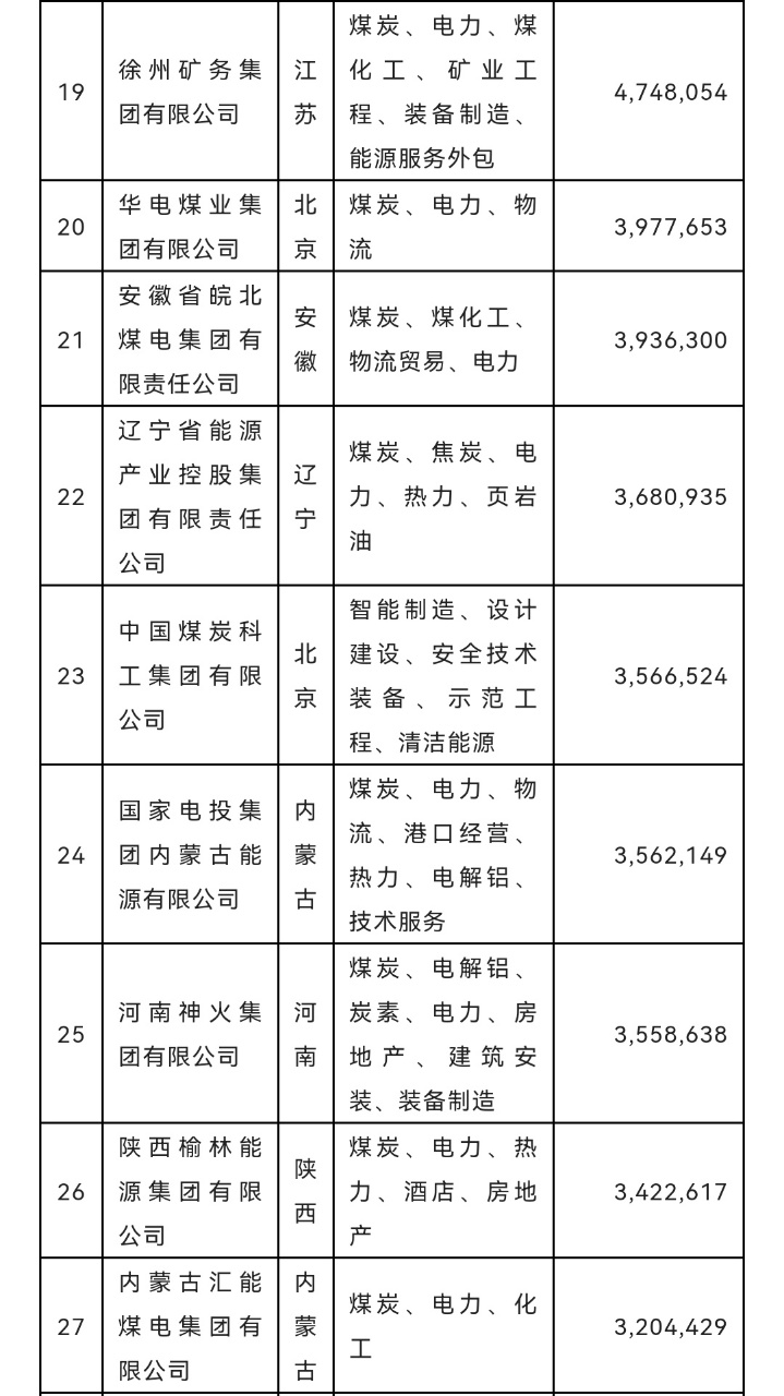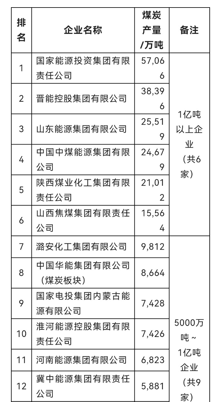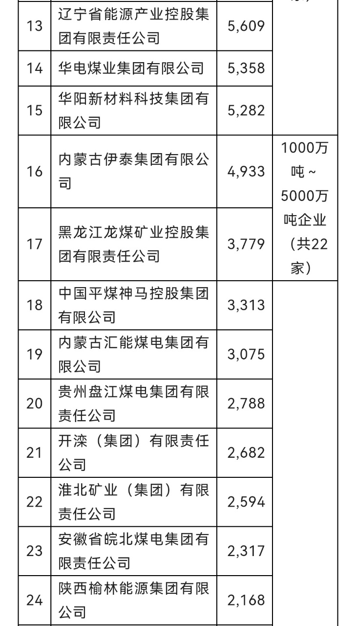 2022中国煤炭企业煤炭产量千万吨以上企业名单