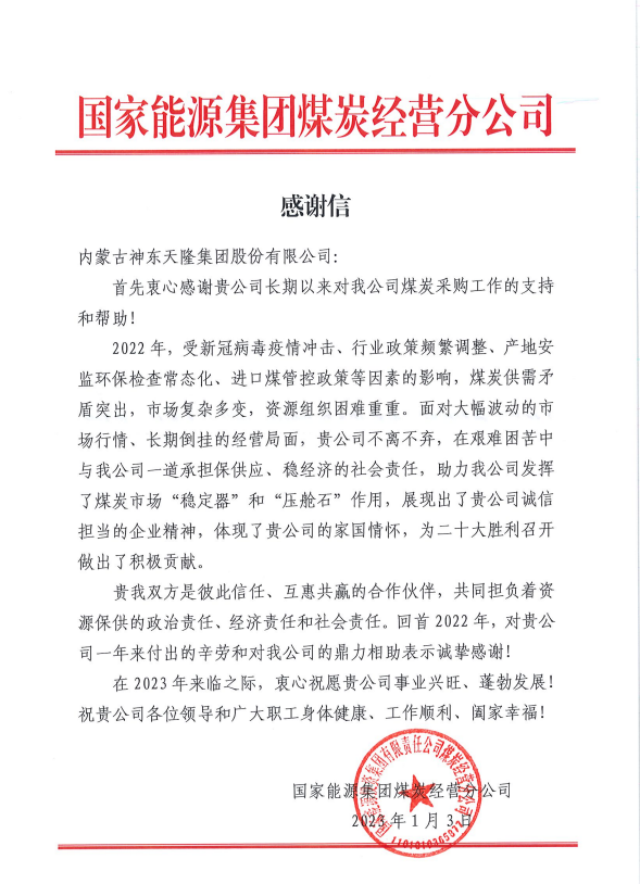 2023年1月3日,国家能源集团煤炭经营分公司以《感谢信》的方式,对集团公司2022年在承担煤炭保供应、稳经济的社会责任,以及助力国家能源集团煤炭经营分公司发挥煤炭市场“稳定器”和“压舱石”作用中,展示出的诚信担当的企业精神及家国情怀给予了充分肯定,对双方彼此信任、互惠互赢的合作伙伴关系予以高度评价。