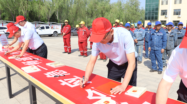 启动活动结束后,全体职工依次在事先准备好的“人人讲安全,个个会应急”横幅上签字,并向矿领导成员发放《煤矿安全生产条例》。