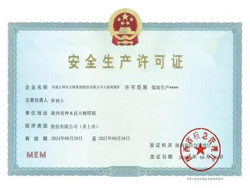 2024年9月5日,大海则煤矿二水平延深项目成功通过安全设施验收,并正式取得了安全生产许可证。