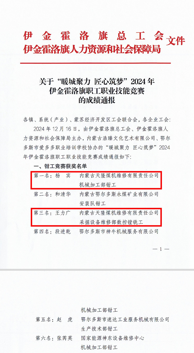 岁末之时,又一喜讯传来。2024年12月16日至17日,在2024年伊金霍洛旗职工职业技能竞赛中,煤机维修公司员工凭借精湛的技艺再获佳绩。