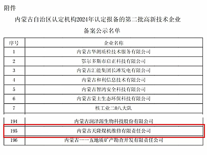 近日,煤机维修公司继获评自治区“科技型中小企业”之后,又凭借不懈努力,在众多企业中脱颖而出,成功通过国家级高新技术企业认证,成为内蒙古自治区2024年第二批获此殊荣的196家企业之一,这一认证无疑是对天隆煤机维修在煤炭机械维修领域的技术实力和创新能力的权威认可。