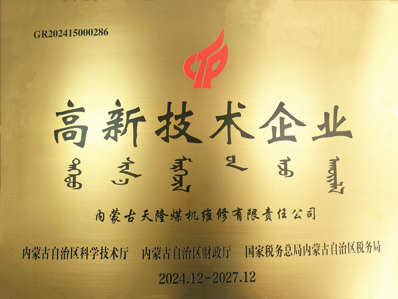 —煤机维修公司荣获国家级“高新技术企业”认证