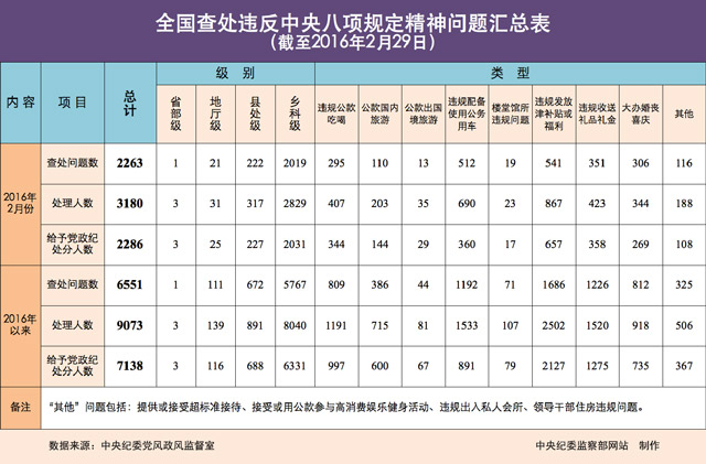 为掌握全国贯彻落实中央八项规定精神情况,中央纪委在31个省区市和新疆生产建设兵团、139个中央和国家机关、111个中央企业、15个中央金融企业建立了落实中央八项规定精神情况月报制度。2016年以来,截至2月29日,全国查处违反中央八项规定精神问题情况见附表。